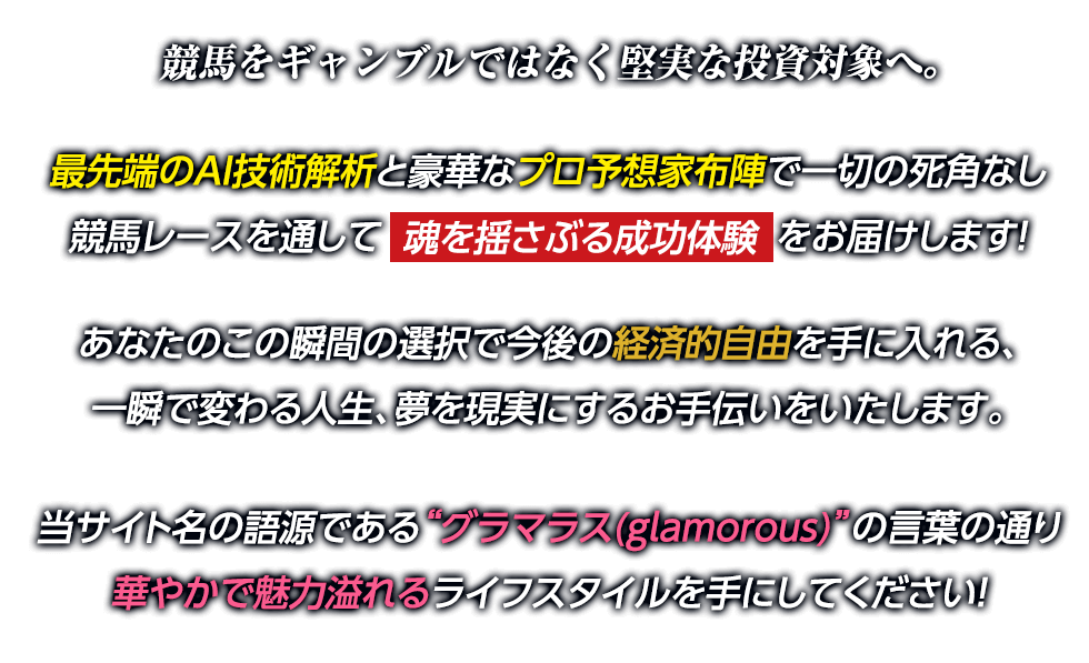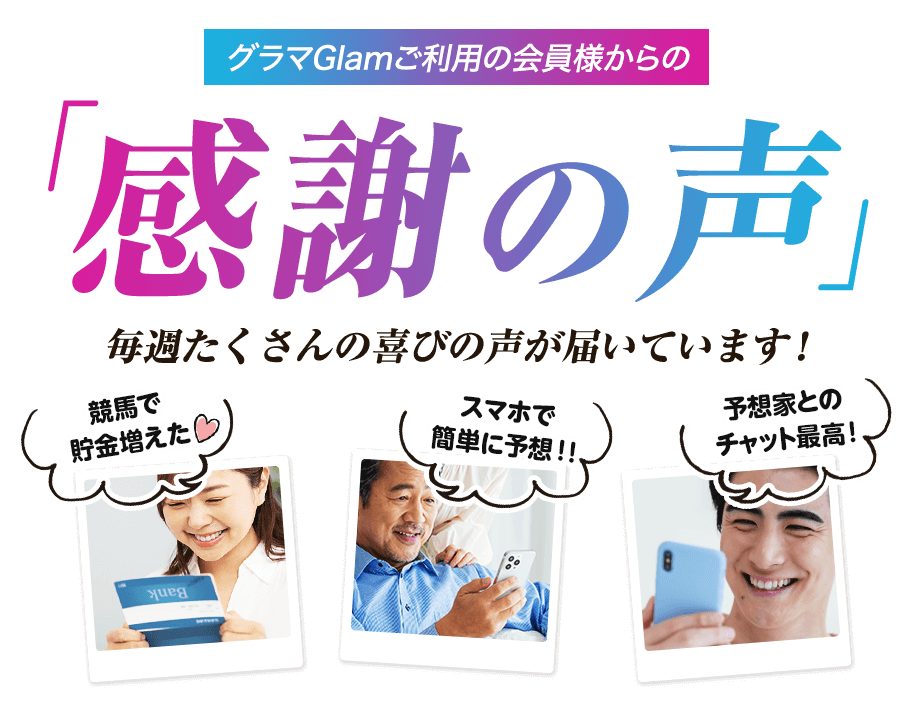 加えてグラマGlamが誇る予想業界最高峰の予想家布陣が一般メディアでは決して入手する事の出来ない現場発信のリアル情報をグラマGlam会員様に余す事なく提供します。